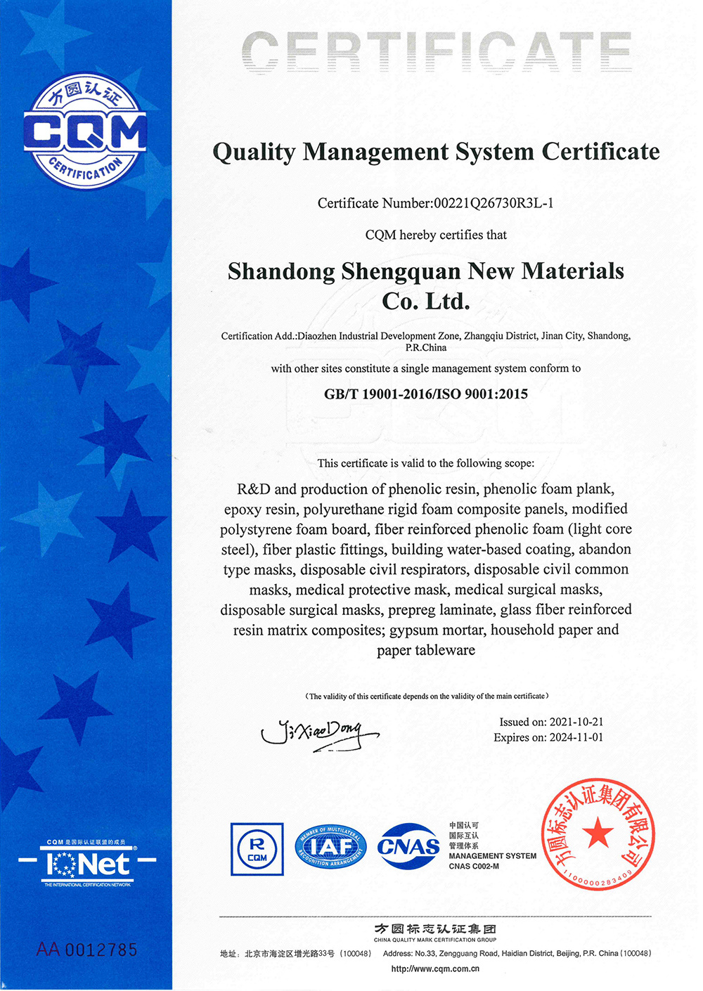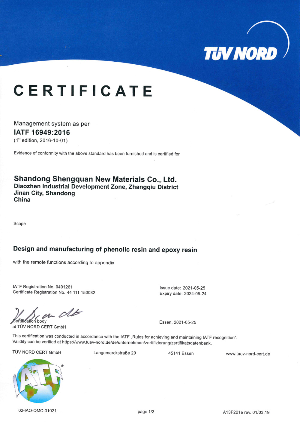 High-performance resin and composites industry is the leading industry of Shengquan. Equipped with highly automated phenolic resin workshop with the largest monomer production capacity around the world and the most advanced technology, SHANDONG SHENGQUAN NEW MATERIALS CO.,LTD (The subsidiary of Shengquan Group) can achieve the annual phenolic resin output of 650,000 tons, ranking the 1st in the world. In addition to the extensive application in aerospace, electronic materials, refractory material, friction material, insulation material, impregnated material, coated abrasive, tire rubber, electrical materials, carbon materials, new energy and other fields, Shengquan Group has further developed a series of low VOC phenolic products, dust-free resins and dust-reducing resins, and has been actively participating in the research and development of new biomass resins, such as being the manufacturer of thermal insulation raw materials for the re-entry capsules of Shenzhou spacecrafts and making contribution to the maiden flight of Long March-5B carrier rocket.