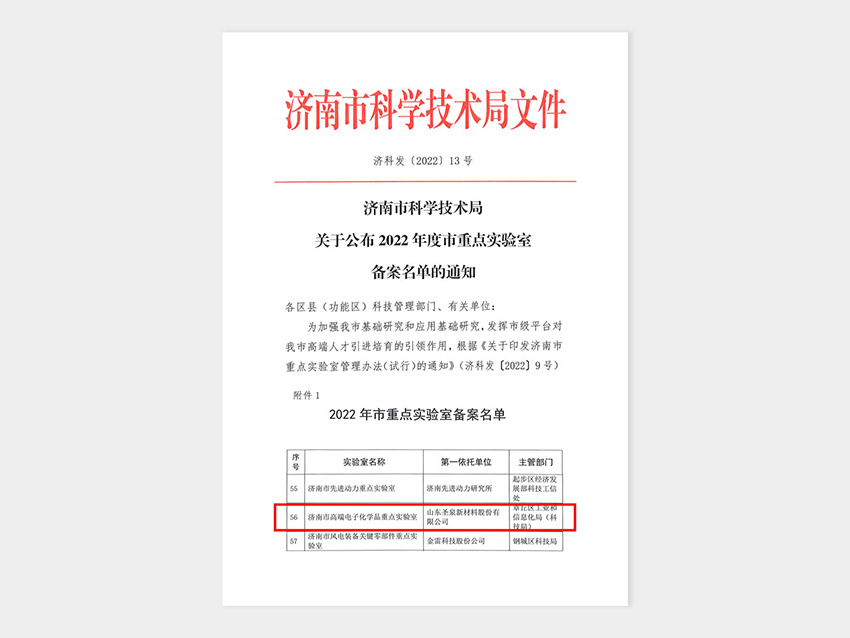 近日,濟南市科學(xué)技術局公布2022年度市重點實驗室備案名單,山東聖泉新材料股份有限公司“高端電子化學(xué)品實驗室”成(chéng)功入選。