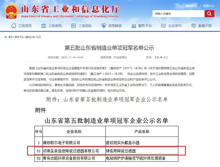 近日,山東省工業和信息化廳、山東省工業經(jīng)濟聯合會(huì)發(fā)布第五批山東省制造業單項冠軍企業名單,聖泉集團控股子公司濟南聖泉倍進(jìn)陶瓷過(guò)濾器有限公司入選。
