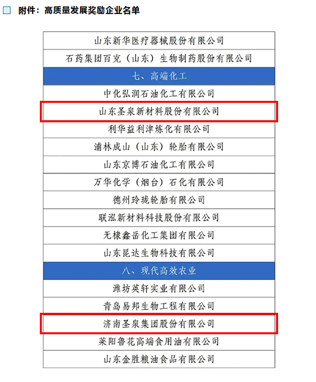 近日,按照山東《省級支持高質量發(fā)展獎勵資金實施細則》規定,省相關“十強”産業專班評選了2020年度高質量發(fā)展獎勵企業名單,全省共有80戶重點企業符合獎勵條件,獲得省級獎勵資金4.94億元。聖泉集團及旗下子公司山東聖泉新材料雙雙入選。
