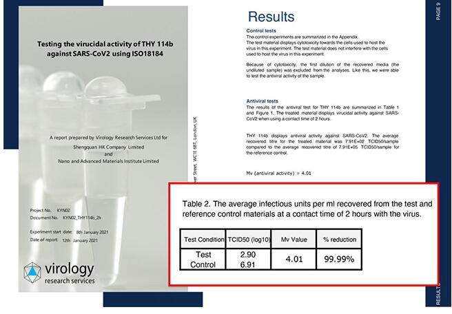 英國(guó)VRS檢測數據:新型冠狀病毒接觸該面(miàn)料120分鍾後(hòu),病毒數減少99.99%