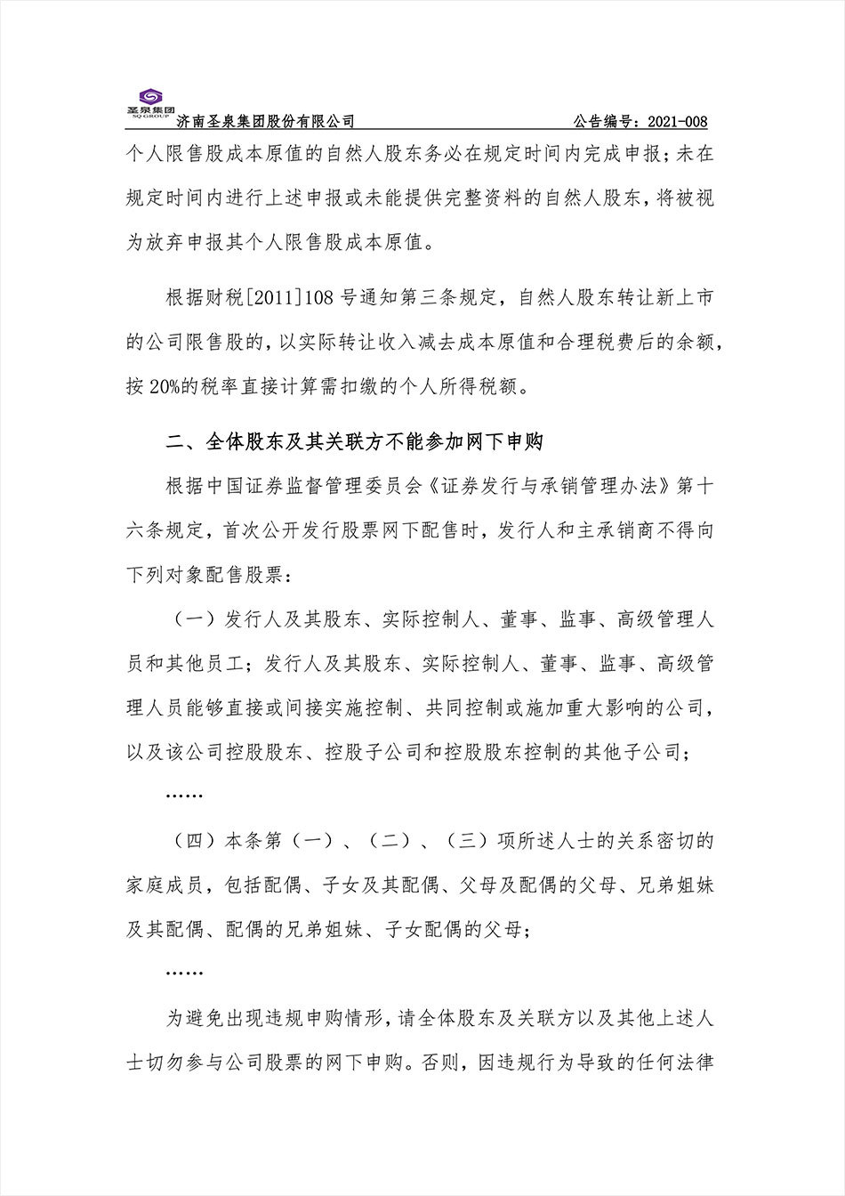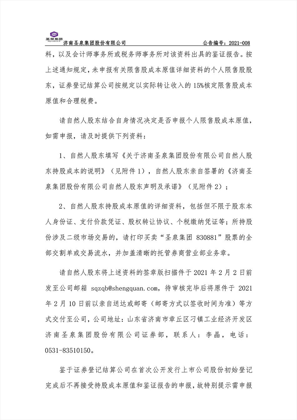 2021-008 聖泉集團:關于提醒股東提供股票原值以及上交所證券賬戶等資料的提示性公告