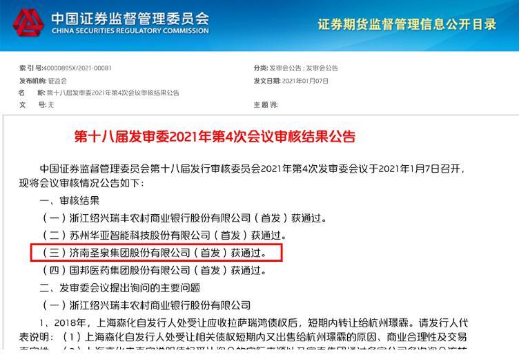 中國(guó)證券監督管理委員會(huì)第十八屆發(fā)行審核委員會(huì)2021年第4次發(fā)審委會(huì)議于2021年1月7日召開(kāi),濟南聖泉集團股份有限公司(首發(fā))獲通過(guò)。