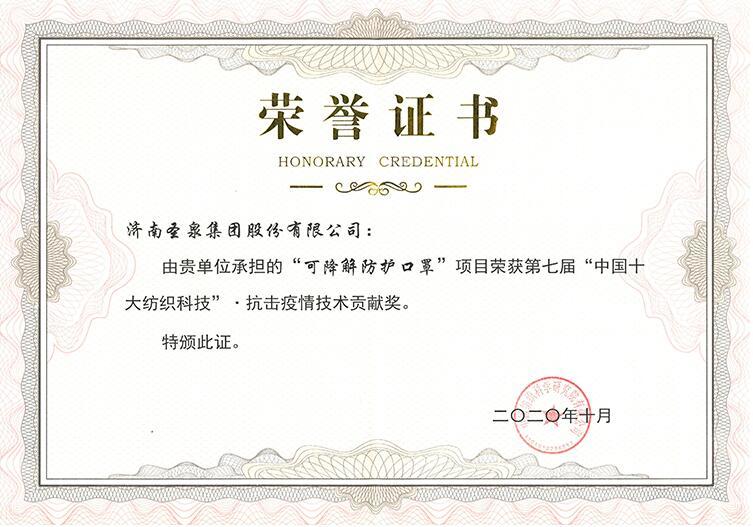 近日,以“追光科技•賦能(néng)産業”爲主題的2020中國(guó)紡織科技成(chéng)果對(duì)接峰會(huì)暨第七屆“中國(guó)十大紡織科技”發(fā)布會(huì)在福建泉州晉江正式舉辦。濟南聖泉集團“可降解防護口罩”項目榮獲“中國(guó)十大紡織科技•抗擊疫情技術貢獻獎”。