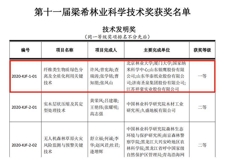 10月25日,我國(guó)林業行業最高水平的科技獎——第十一屆梁希林業科學(xué)技術獎獲獎名單公布。濟南聖泉集團股份有限公司聯合北京林業大學(xué)申報的“纖維類生物質綠色分離及全質化利用關鍵技術”項目獲技術發(fā)明獎一等獎。