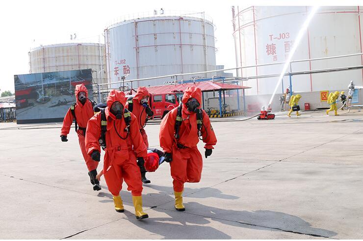 演練模拟罐區TJ04糠醛儲罐因洩露發(fā)生火警,企業實施先期處置的同時(shí),市應急指揮中心和消防救援支隊接到報警後(hòu),立即啓動應急救援預案,調集多方應急力量聯動處置。在聖泉集團救援隊、章丘區刁鎮消防中隊和濟南市消防支隊全力撲救下,火勢最終得到撲滅。