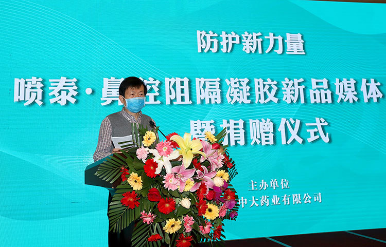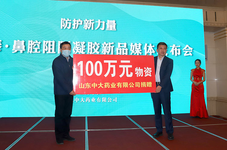 發(fā)布會(huì)上,山東中大藥業董事(shì)長(cháng)孟慶文通過(guò)濟南紅十字會(huì)向(xiàng)醫院、航空、火車站、汽車站等防疫一線單位以及廣大交警、環衛工人等一線群體定向(xiàng)捐贈100萬元噴泰鼻腔阻隔凝膠物資。