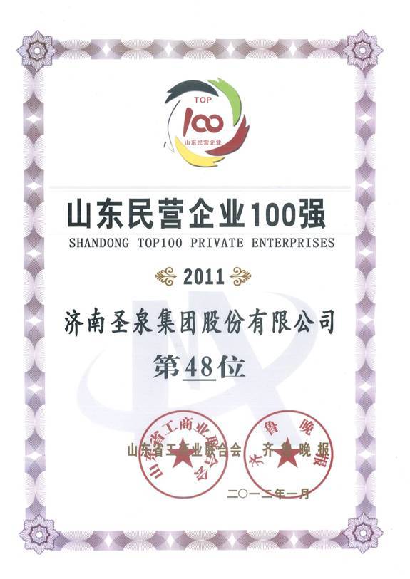2012年1月10日,由山東省工商聯和齊魯晚報聯合主辦、我公司獨家冠名贊助的2011年度“聖泉·安特福”杯“山東省民營企業100強”等三項評選活動頒獎盛典在濟南隆重舉行。我公司榮獲“山東省民營企業100強”(排名第48位)和“山東省民營企業公益之星”(排名第37位)兩(liǎng)項榮譽稱号。