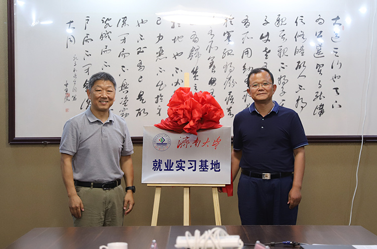 濟南大學(xué)合作發(fā)展處處長(cháng)呂嘉甯、濟南聖泉集團常務副總裁徐傳偉共同爲就(jiù)業實習基地揭牌。