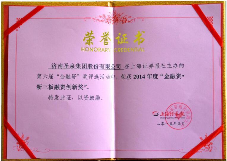 聖泉集團獲評2014年度“金融資•新三闆融資創新獎”