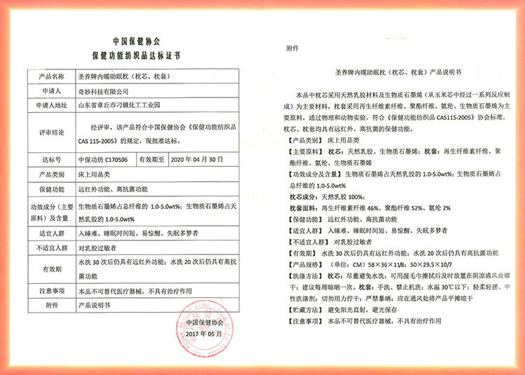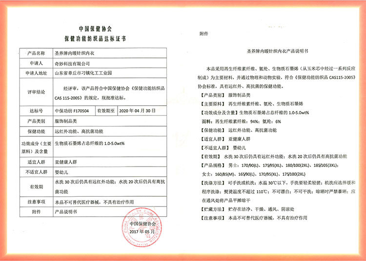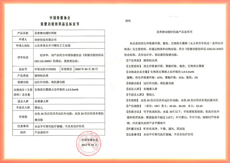 此外,在達标證書中還(hái)顯示,以上聖養牌産品具有遠紅外、高抗菌的保健功能(néng)。水洗30次後(hòu)仍具有遠紅外功能(néng);水洗20次後(hòu)仍具有高抗菌功能(néng)。