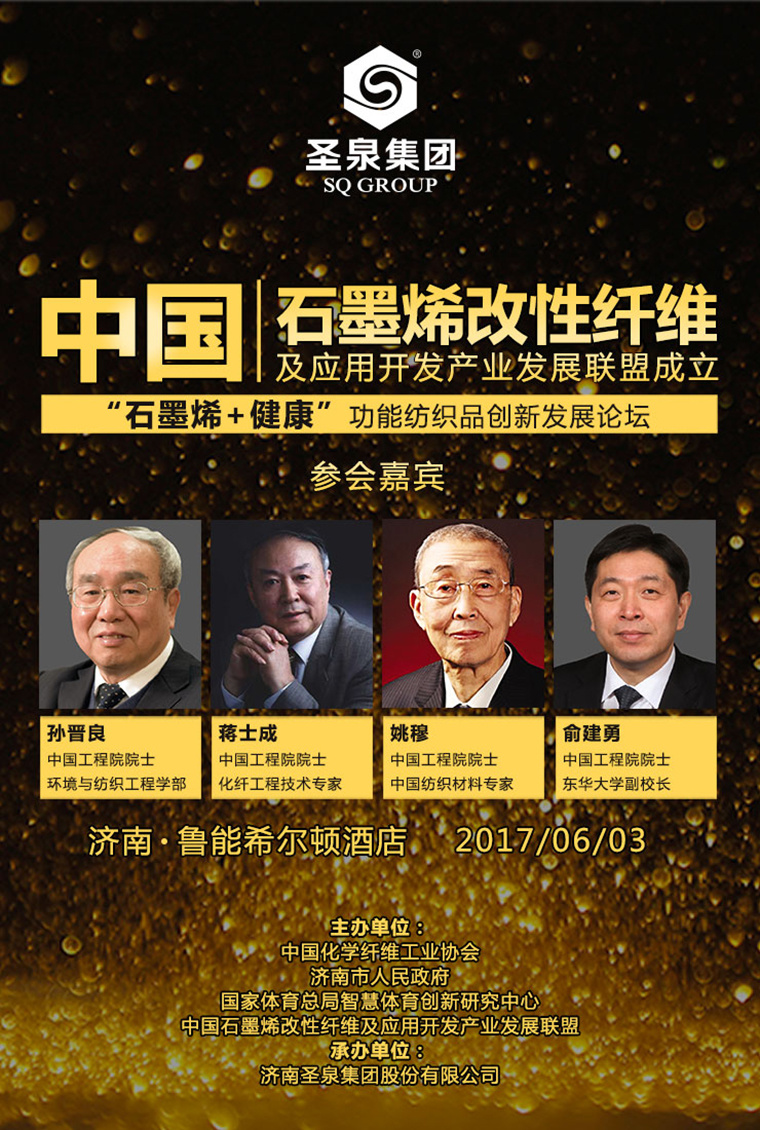 爲更好(hǎo)地推動“石墨烯+健康”功能(néng)紡織品的産業發(fā)展,實現跨界融合和産業升級。由中國(guó)紡織工業聯合會(huì)指導,中國(guó)化學(xué)纖維工業協會(huì)、濟南市人民政府、國(guó)家體育總局智慧體育創新研究中心及中國(guó)石墨烯改性纖維及應用開(kāi)發(fā)産業發(fā)展聯盟聯合主辦的“石墨烯+健康”功能(néng)紡織品創新發(fā)展論壇,將(jiāng)于2017年6月3日在濟南召開(kāi),在此誠邀各行業精英參會(huì)交流。