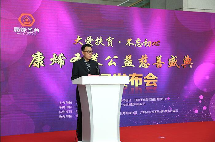 2017年2月22日上午,山東廣播電視台系列扶貧宣傳活動之“‘大愛扶貧,不忘初心’康烯聖養公益慈善盛典”新聞發(fā)布會(huì)在山東廣播電視台綜合業務樓一樓大廳舉行。山東省扶貧政策調研組調研員尹永海,山東省扶貧開(kāi)發(fā)基金會(huì)秘書長(cháng)王景輝,山東廣播電視台黨委書記、台長(cháng)呂芃,山東廣播電視台黨委副書記、總編輯李翠芳,山東廣播電視台黨委委員、副台長(cháng)林修功,山東廣電傳媒集團籌備工作領導小組組長(cháng)張先等省領導、章丘區扶貧辦領導,濟南聖泉集團股份有限公司總裁唐地源,總裁助理呂冬生等共計60餘人共同出席了發(fā)布會(huì)。