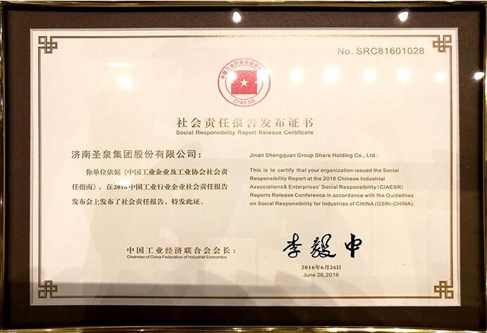2016年6月,聖泉集團隆重發(fā)布《濟南聖泉集團股份有限公司2015年社會(huì)責任報告》,打響了聖泉集團在履行社會(huì)責任方面(miàn)敢于負責、勇于擔責的品牌形象,進(jìn)一步提高了聖泉的社會(huì)信譽和企業競争力,增強了企業社會(huì)地位和品牌影響力。公司將(jiāng)以此榮譽爲契機,繼續努力,持續創新,繼續加強社會(huì)責任,以責任之基譜寫聖泉集團可持續發(fā)展藍圖。