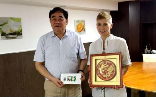 意大利前國(guó)家衆議院議長(cháng)、意大利對(duì)華友好(hǎo)協會(huì)主席、意大利意中發(fā)展基金董事(shì)局主席艾琳·皮維蒂與董事(shì)長(cháng)唐一林交換紀念品并合影