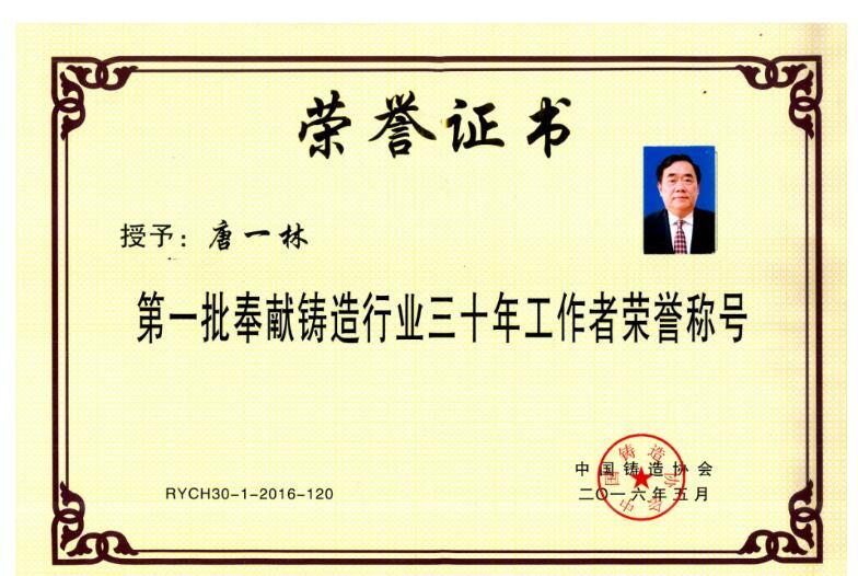 董事(shì)長(cháng)榮獲“第一批奉獻鑄造行業三十年工作者”榮譽稱号