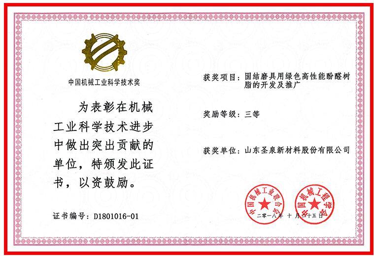 近日,山東聖泉新材料股份有限公司的“固結磨具用綠色高性能(néng)酚醛樹脂的開(kāi)發(fā)與推廣”項目榮獲中國(guó)機械工業科學(xué)技術獎三等獎,項目的主要完成(chéng)人李枝芳、邢介名、Ian Seward、王軒、焦峰和趙金隊也被授予中國(guó)機械工業科學(xué)技術獎突出貢獻工作者三等獎。