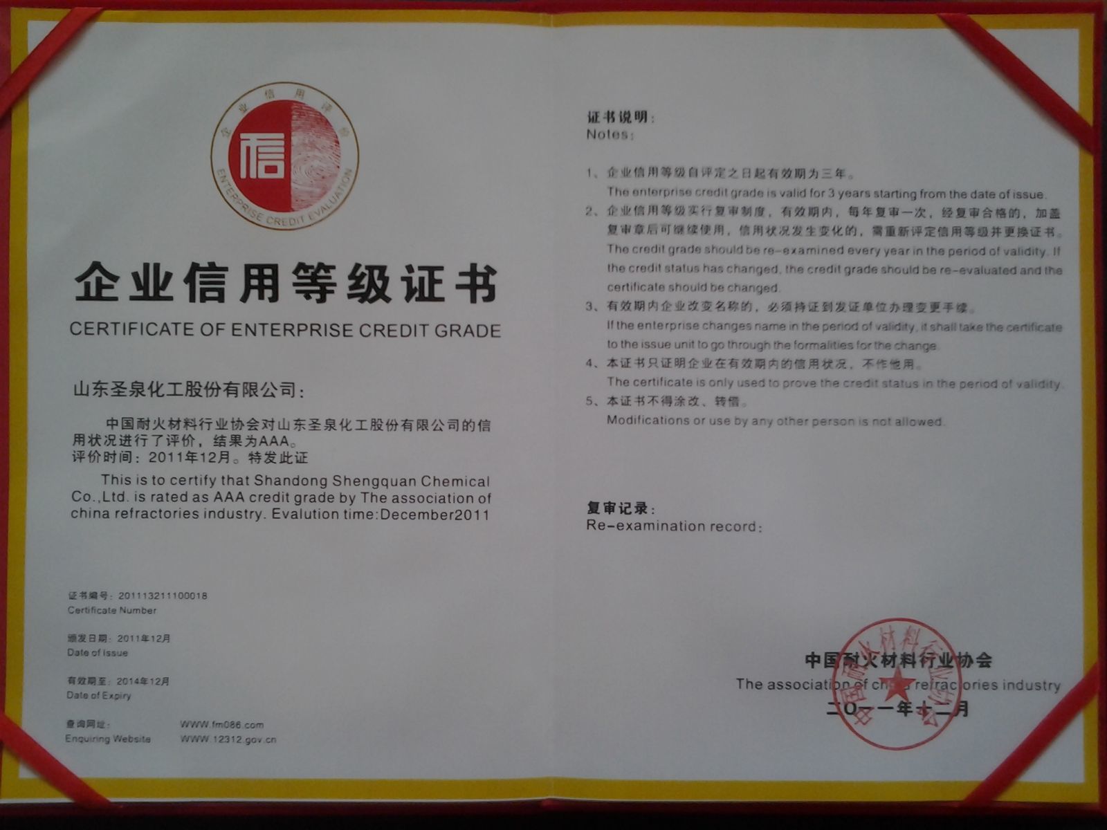 2011年12月2日,中國(guó)耐火材料行業首批企業信用等級評價工作總結會(huì)議在山東濟南召開(kāi)。行業第一批42家被評定爲A級以上信用等級的企業獲得了信用等級證書并接受了牌匾。經(jīng)中國(guó)耐材協會(huì)評估與評價機構審核确定,聖泉化工被評爲AAA級信用企業。這(zhè)是對(duì)公司多年來信用建設的肯定,爲公司的資質實力又增添了濃墨重彩的一筆。公司將(jiāng)以此次獲獎爲契機,進(jìn)一步加強企業信用體系建設,推進(jìn)行業信用建設的不斷深化,促進(jìn)我國(guó)耐材工業的持續健康穩定發(fā)展!