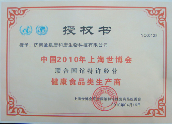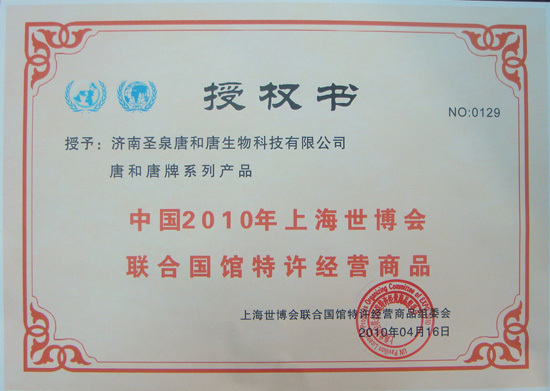 4月16日,我公司與上海世博會(huì)聯合國(guó)館特許經(jīng)營商品組委會(huì)正式簽約,唐和唐成(chéng)爲2010上海世博會(huì)聯合國(guó)館特許經(jīng)營品牌,組委會(huì)授權唐和唐兩(liǎng)項殊榮,公司被授予“中國(guó)2010年上海世博會(huì)聯合國(guó)館特許經(jīng)營商品生産商(健康食品類)”,“中國(guó)2010年上海世博會(huì)聯合國(guó)館特許經(jīng)營商品”榮譽稱号。世博期間唐和唐系列産品將(jiāng)在聯合國(guó)館精品展覽中進(jìn)行展示,所有産品進(jìn)入聯合國(guó)采購目錄,同時(shí)所有産品進(jìn)入聯合國(guó)特許經(jīng)營商品連鎖加盟店。世博期間,聯合國(guó)館舉辦高層論壇,屆時(shí)參加論壇的主要國(guó)家領導人將(jiāng)獲贈唐和唐有代表性的高端禮品和唐因子。