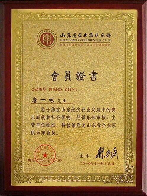 山東企業家俱樂部會(huì)員證書