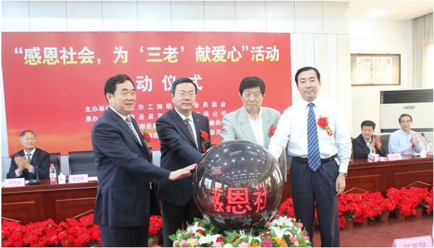 2010年10月9日,由濟南市工商聯直屬會(huì)員商會(huì)主辦、濟南聖泉集團股份有限公司組織承辦的“感恩社會(huì)、爲‘三老’獻愛心活動”啓動儀式在聖泉集團舉行,省政協副主席、省工商聯主席王乃靜、省委統戰部副部長(cháng)孫傳宏、濟南市委統戰部部長(cháng)楊慶林、章丘市委書記畢筱奇等省市領導出席儀式發(fā)表講話并爲活動按下啓動球。活動的啓動,是聖泉集團弘揚中華民族傳統美德、積極履行社會(huì)責任、感恩社會(huì)、回饋社會(huì)的又一大愛心行動。活動緊扣時(shí)代主題,契合社會(huì)需求,意義深遠。