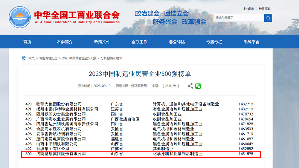 9月12日,由全國(guó)工商聯、山東省人民政府主辦的2023中國(guó)民營企業500強峰會(huì)暨全國(guó)優強民營企業助力山東綠色低碳高質量發(fā)展大會(huì)在山東濟南舉行。會(huì)上發(fā)布“2023中國(guó)民營企業500強”、“2023中國(guó)制造業民營企業500強”、“2023中國(guó)服務業民營企業100強”榜單。濟南聖泉集團股份有限公司再次入選“2023中國(guó)制造業民營企業500強”榜單,也是公司自2011年活動啓動以來連續第12次入選。
