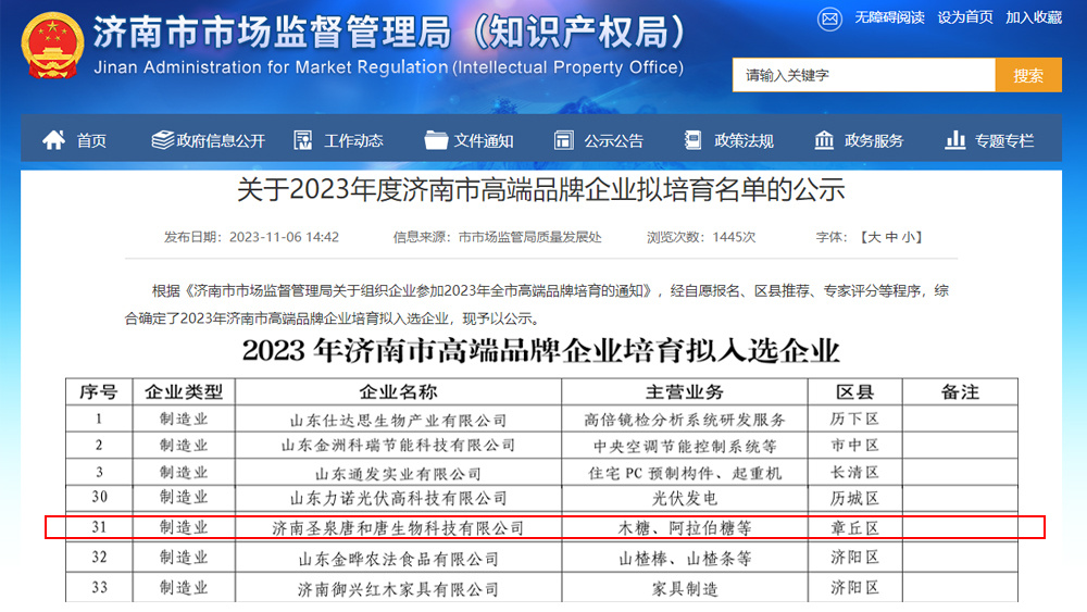近日,濟南市市場監督管理局質量發(fā)展處公布2023年濟南市高端品牌企業培育拟入選企業名單。濟南聖泉唐和唐生物科技有限公司憑借優異的産品質量、先進(jìn)的技術工藝和優秀的品牌影響力成(chéng)功入選該培育名單。
