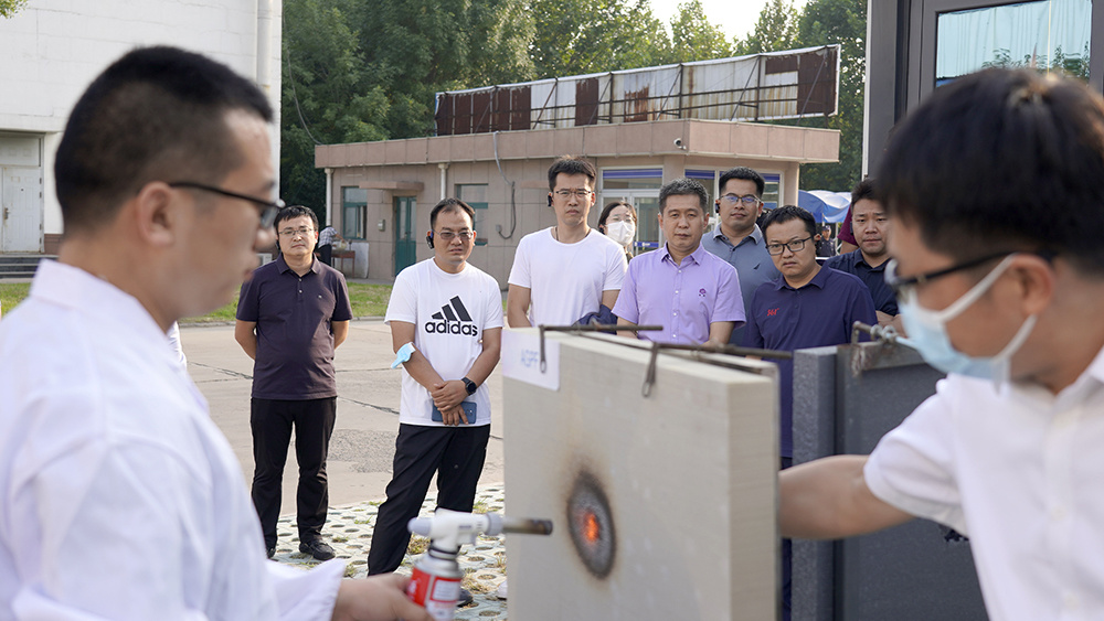 在建築節能(néng)産品生産車間,建築節能(néng)事(shì)業部總經(jīng)理張壯介紹了外牆保溫材料AGPF闆的生産及應用情況,并向(xiàng)調研組展示了産品樣闆房,雙方就(jiù)安特福最新産品光伏保溫裝飾一體闆進(jìn)行了深入交流。同時(shí)通過(guò)對(duì)比試驗,現場檢測了AGPF闆的防火性能(néng),調研組對(duì)AGPF闆阻燃保溫、綠色節能(néng)的優異特性給予高度肯定。