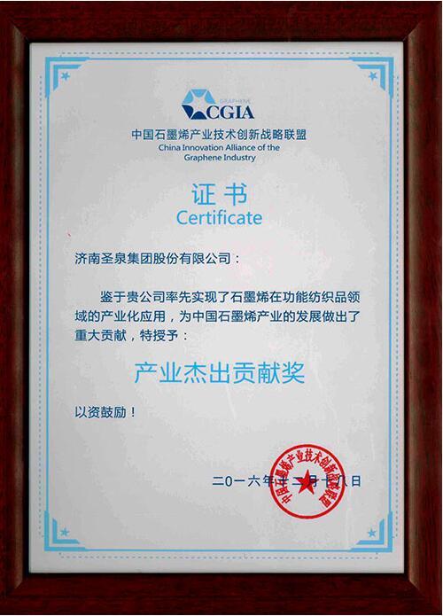 爲促進(jìn)石墨烯産業走入創新發(fā)展的良性軌道(dào),中國(guó)石墨烯産業技術創新戰略聯盟第一年設立産業傑出貢獻獎,條件是率先開(kāi)發(fā)出某一領域的石墨烯應用産品,并已經(jīng)累計形成(chéng)2000萬元以上的銷售。經(jīng)推薦,在功能(néng)紡織纖維領域取得突出貢獻的聖泉集團聯同三家在其他領域取得突出貢獻的企業一道(dào)被評爲2016年度“石墨烯産業傑出貢獻獎”。