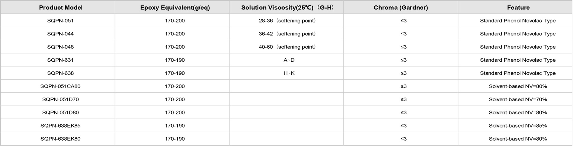 Shengquan® Phenol Novolac Epoxy Resin has more than two epoxy groups in its molecular structure, so the cured product has high cross-linking density and excellent adhesive strength, heat resistance and chemical resistance.