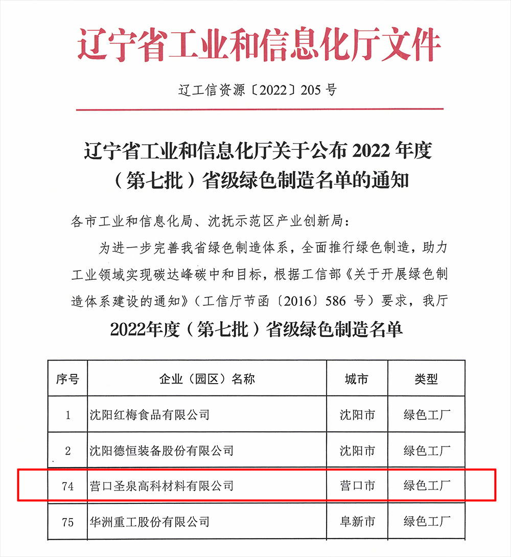 營口聖泉高科材料有限公司喜獲省級綠色工廠稱号
