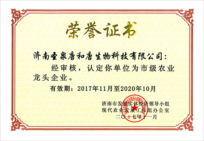 濟南聖泉唐和唐生物科技有限公司喜獲 “農業産業化經(jīng)營市級農業龍頭企業”榮譽