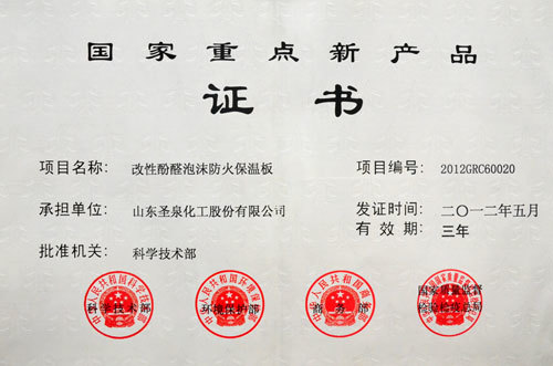“聖泉·安特福”改性酚醛泡沫防火保溫闆,以其優異的防火、隔熱、隔音、輕質節能(néng)、保溫之王等性能(néng),卓越的安全、環保、綠色、節能(néng)低碳等社會(huì)效益和生态效益,通過(guò)了國(guó)家科技部、環保部、商務部、質檢總局等四部委的聯合評定,榮獲“國(guó)家重點新産品”殊榮。并獲國(guó)家重點新産品資金支持。“聖泉·安特福”改性酚醛泡沫防火保溫闆將(jiāng)在國(guó)家重點工程招标、政府采購、研發(fā)費投入及稅收等方面(miàn)獲重點支持。國(guó)家從戰略層面(miàn)發(fā)揮産品創新的示範、引導和推動作用,帶動國(guó)内産業結構優化升級和産品結構調整。